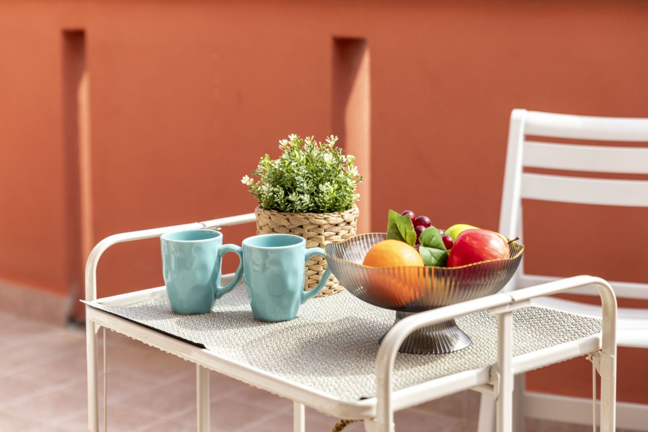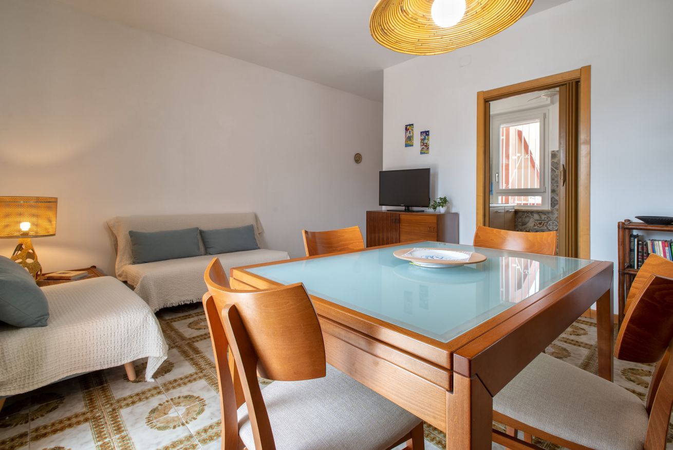 - LIVING ROOM with two sofas, dining table, 32" TV, split A/C and access to the terrace;