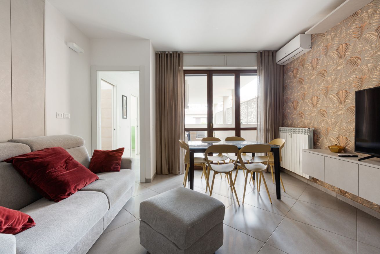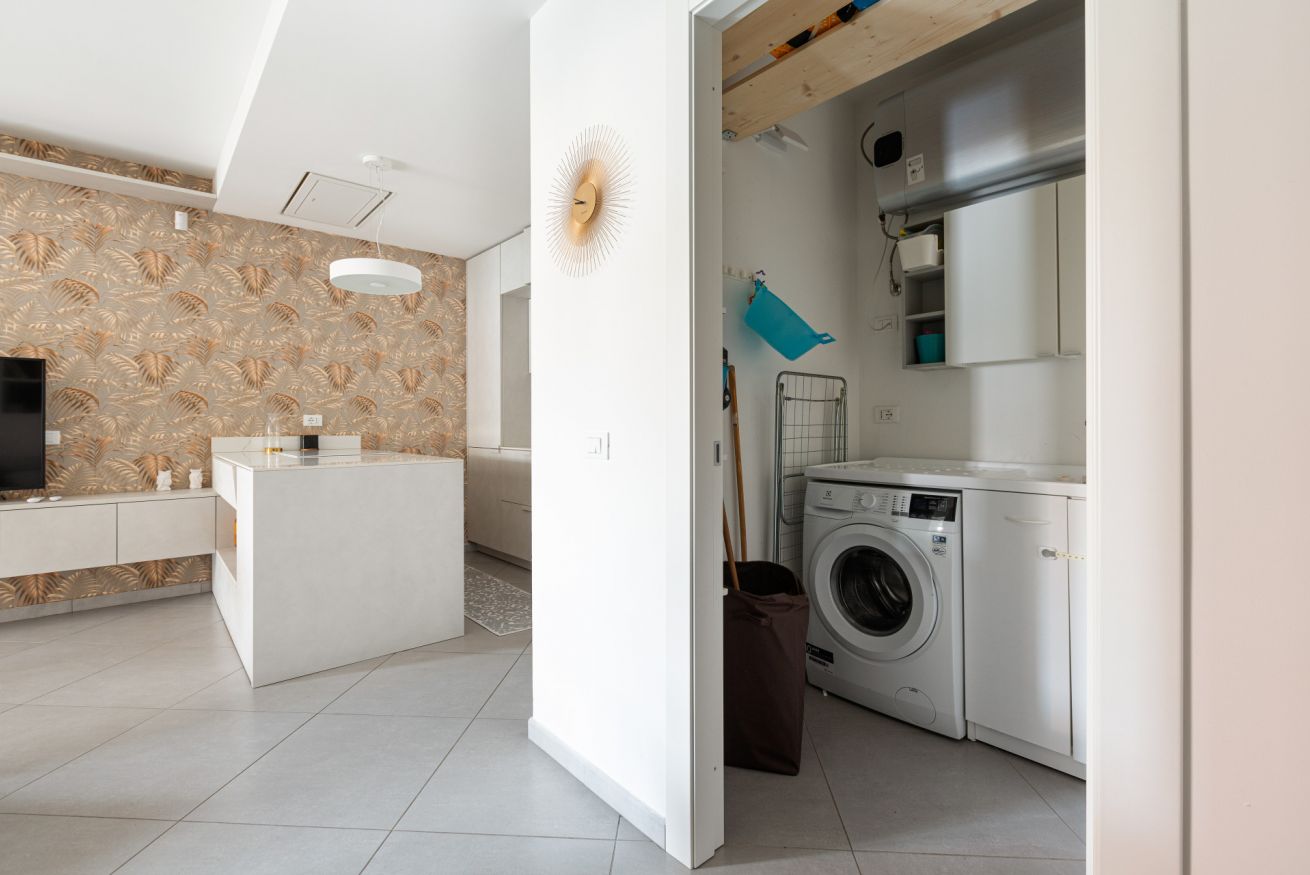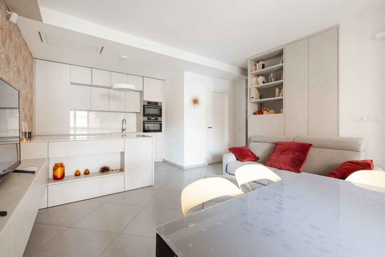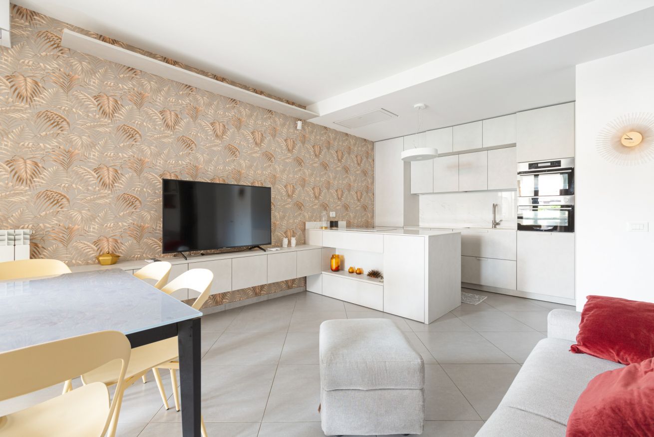 -INGRESSO con SALOTTO con divano letto matrimoniale e Smart TV 43'' e angolo cottura con piano cottura a induzione, forno, microonde, frigo, lavastoviglie. Split AC