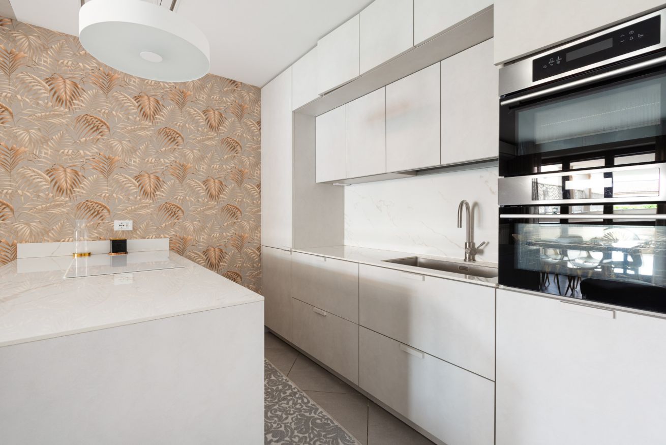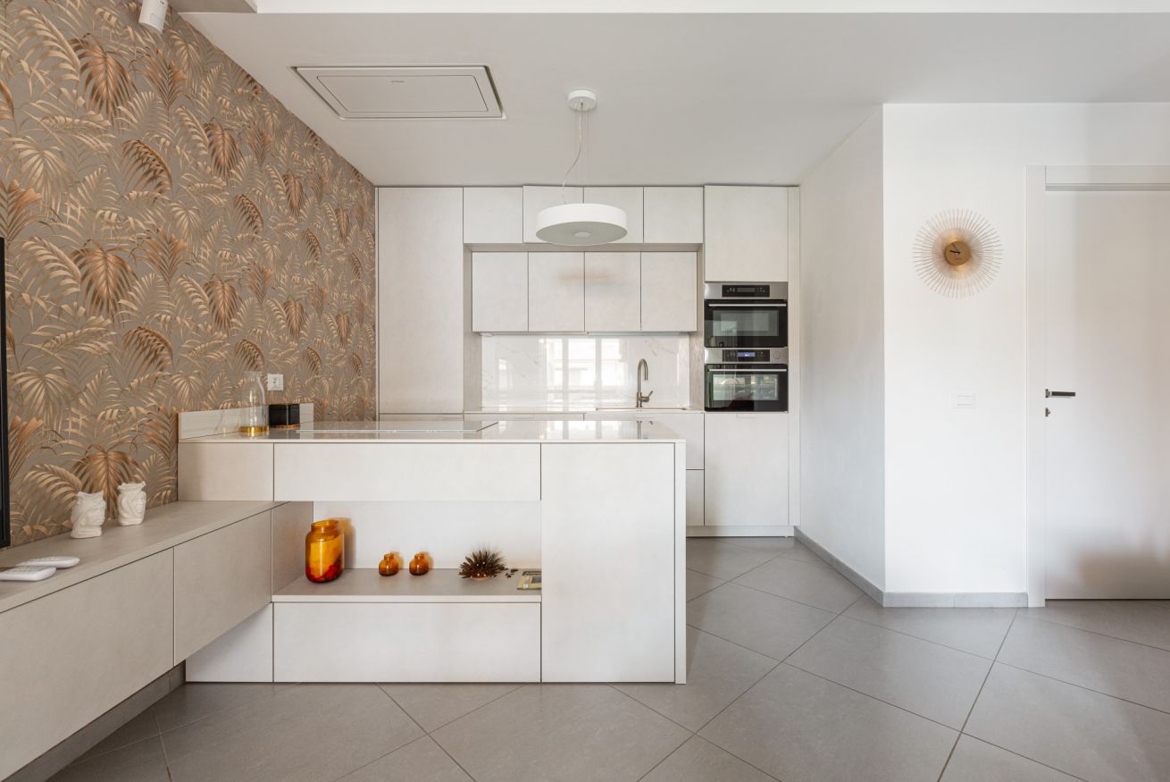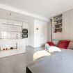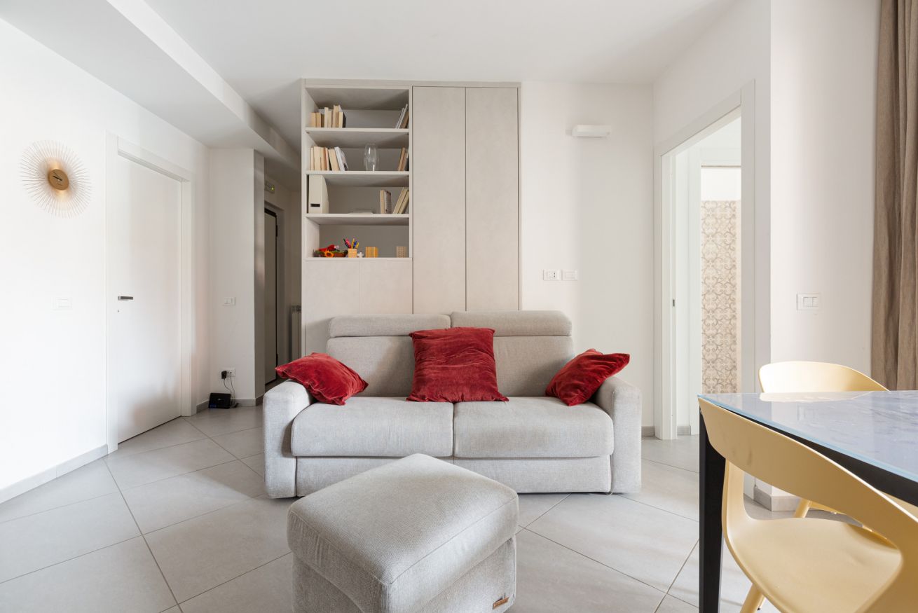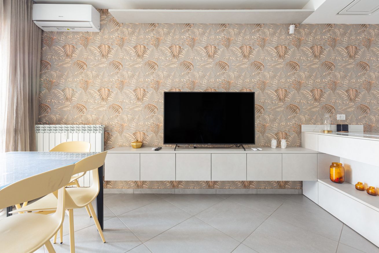 -INGRESSO con SALOTTO con divano letto matrimoniale e Smart TV 43'' e angolo cottura con piano cottura a induzione, forno, microonde, frigo, lavastoviglie. Split AC