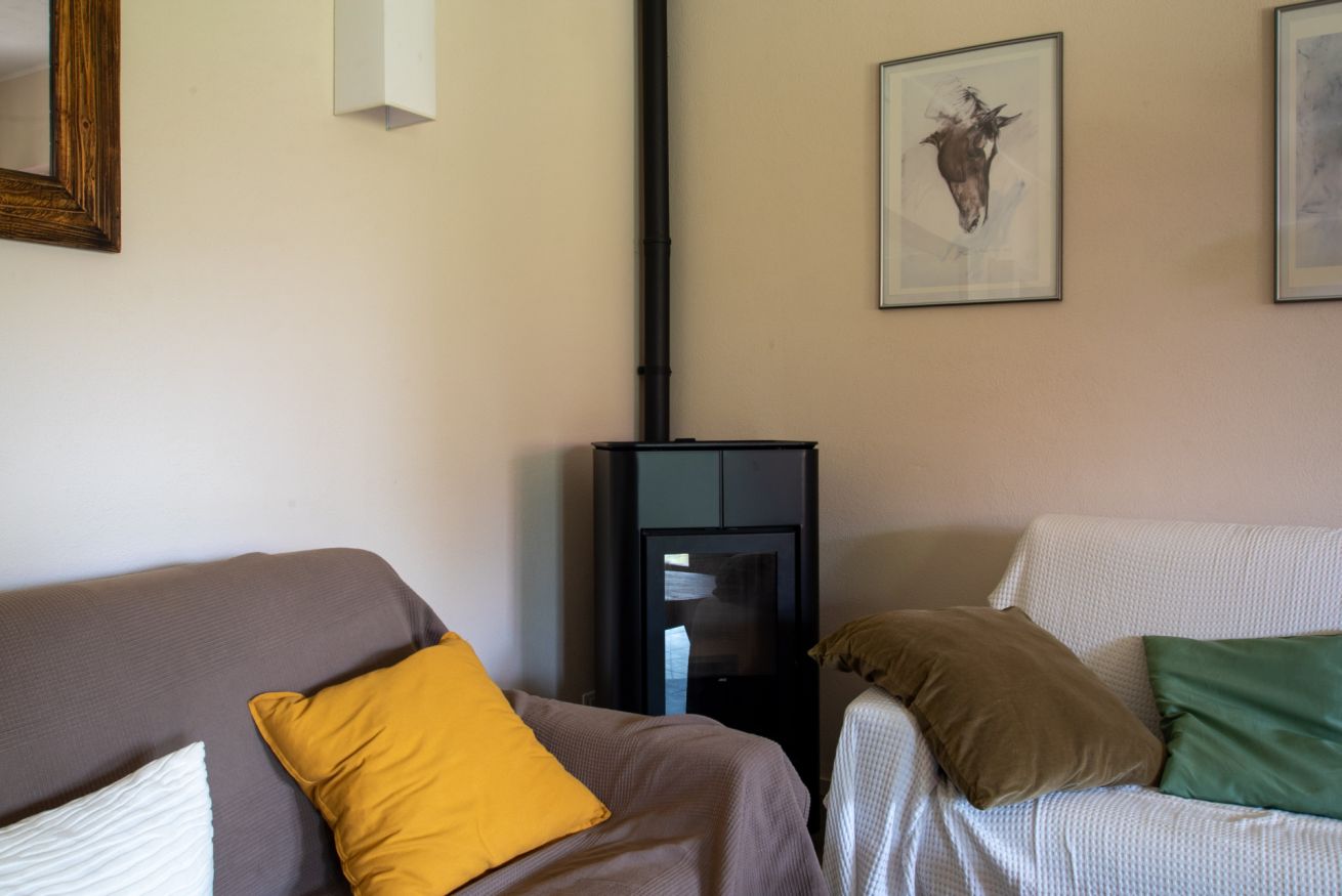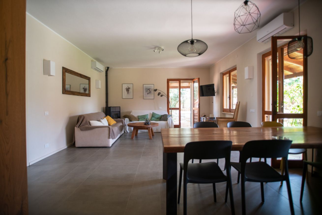 - LIVING ROOM with two double sofa beds, TV, table with chairs, split A/C, pellet stove, access to the garden;