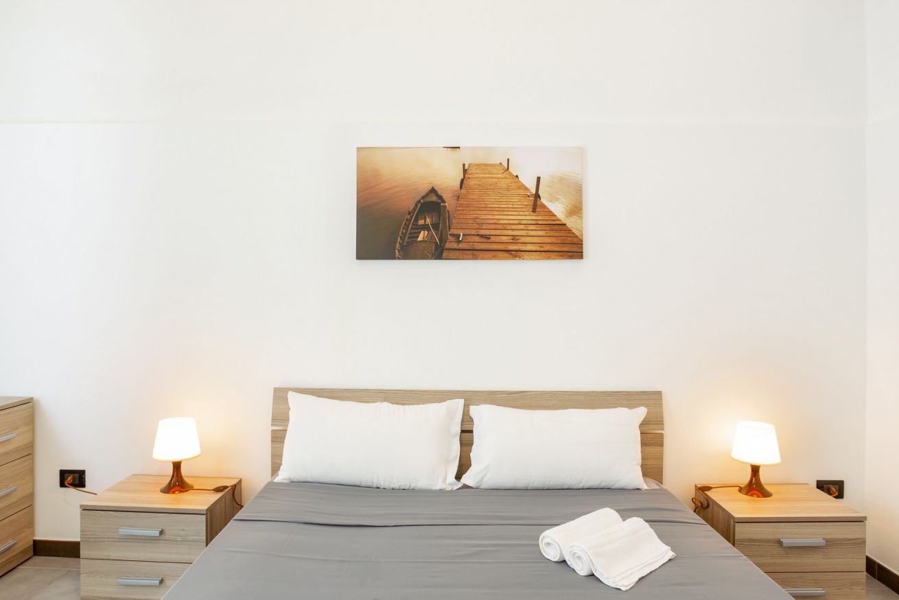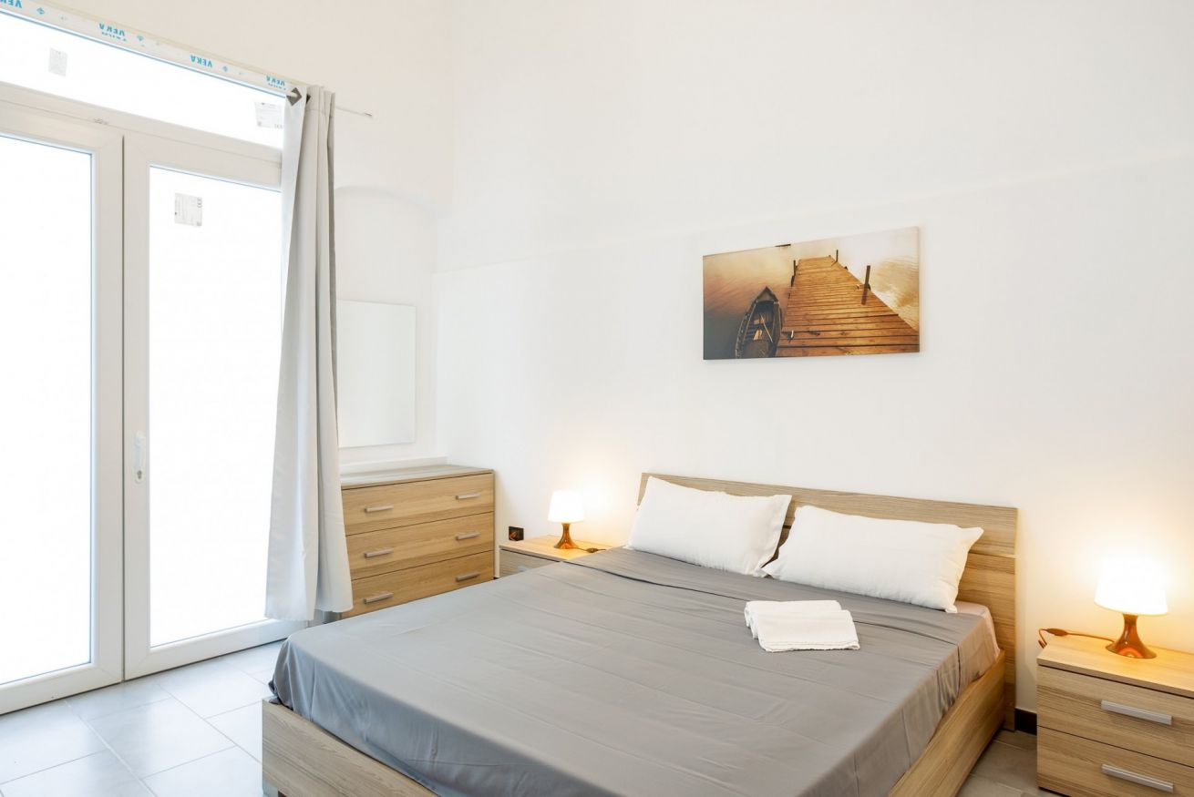 - Camera da letto con letto matrimoniale, guardaroba, cassettiera e split A/C