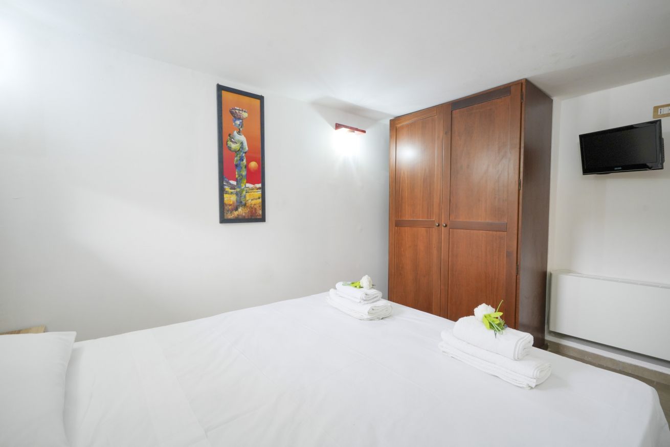 - ROOM I with double bed, wardrobe and TV (note an internal step)