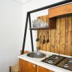 - CUCINA con tavolo da pranzo e piccolo angolo cottura attrezzato con fornelli a gas, frigorifero, freezer e moka
