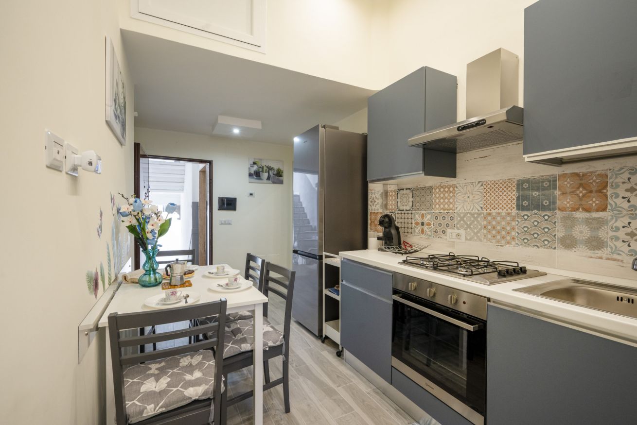 - CUCINA con piano cottura a gas (4 fuochi), frigorifero, freezer, macchina del caffè, moka, bollitore, forno, utensili da cucina e tavolo da pranzo;