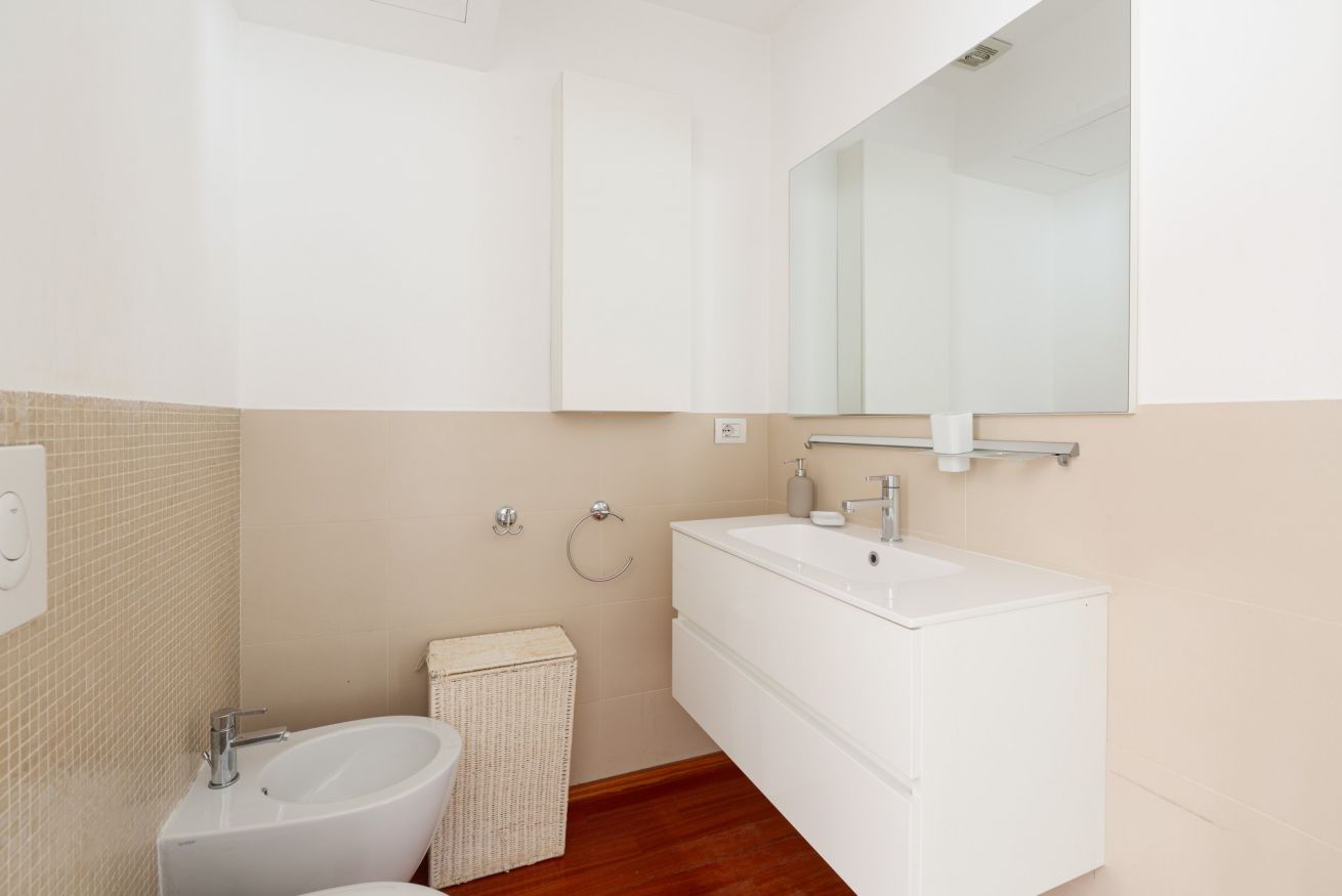 - BATHROOM (with a step) with shower cubicle, sink, bidet, WC, washing machine.