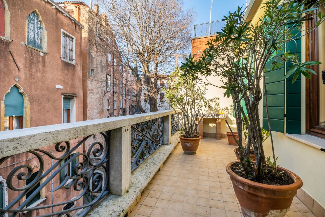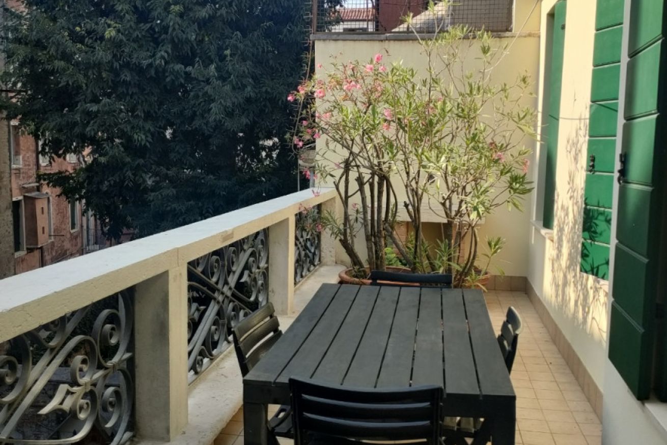 -TERRACE: large balcony with plants and view of the suggestive Venetian courtyard. Equipped with outdoor table and chairs.
