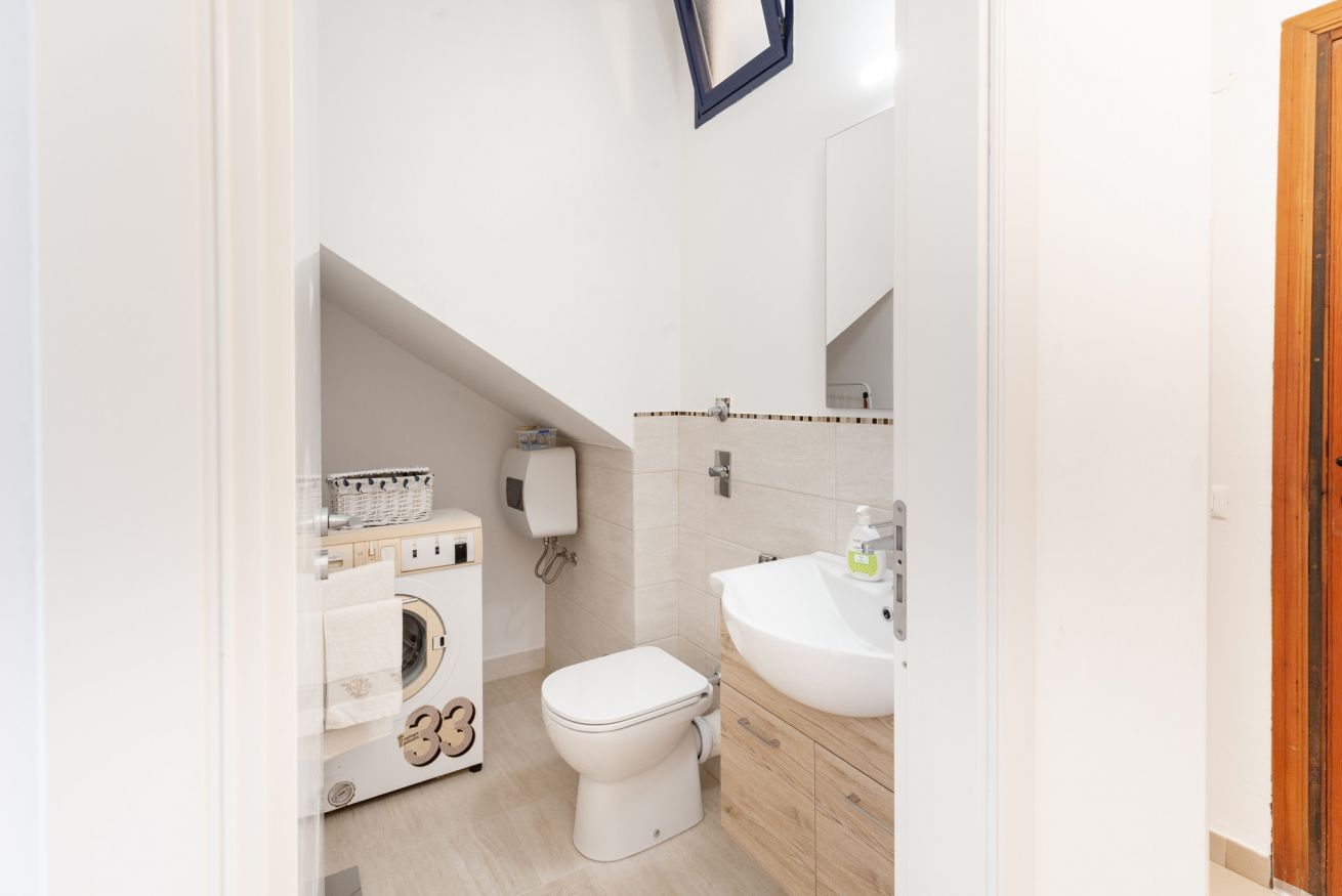ULTERIORI SERVIZI A DISPOSIZIONE DEGLI OSPITI: aria condizionata con pompe di calore (split in soggiorno e nelle due camere da letto), lavatrice (nel bagno di servizio al livello inferiore), stendibiancheria, ferro e asse da stiro e asciugacapelli.
