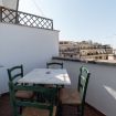 LIVING ROOM: relaxation area with two sofas (NOT sofa beds) and TV, dining area with wooden table and chairs, portable fan. Direct access to the terrace with table and four chairs, panoramic view of the city.