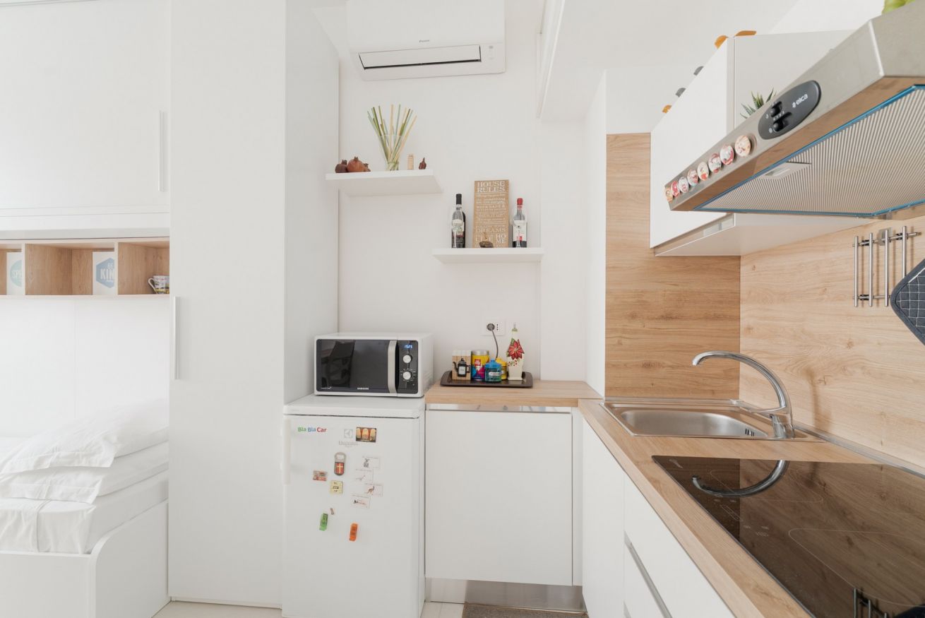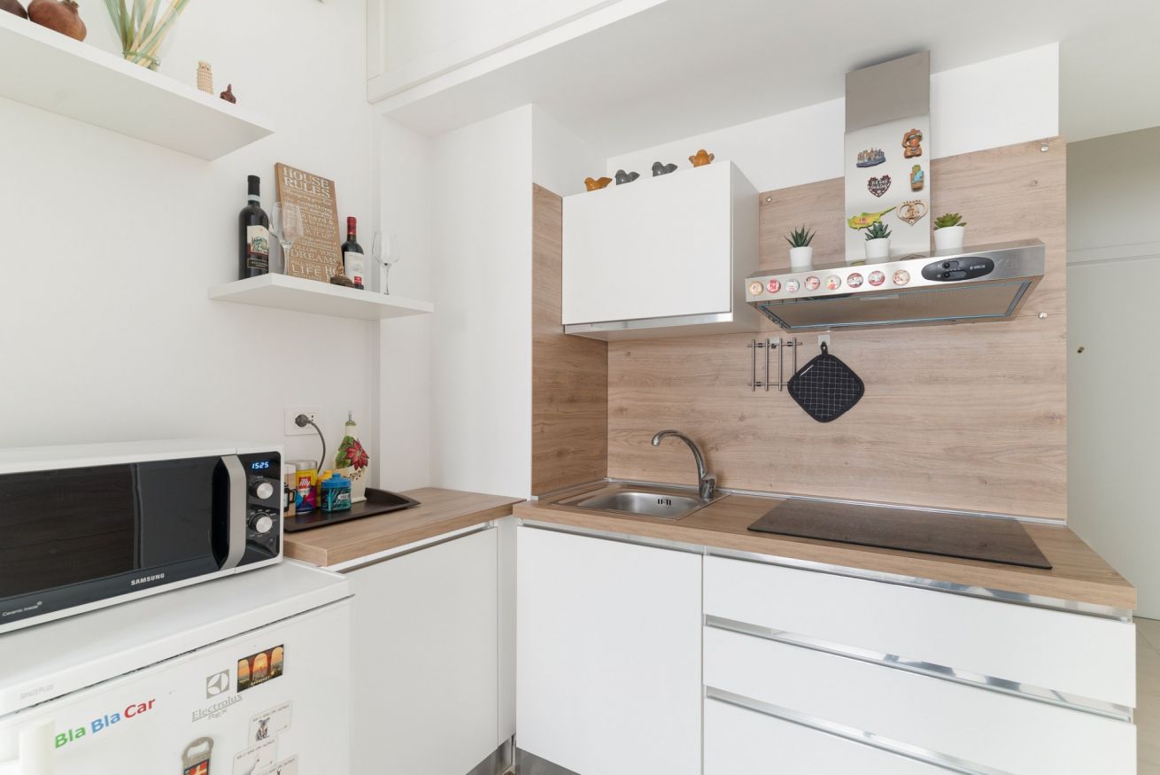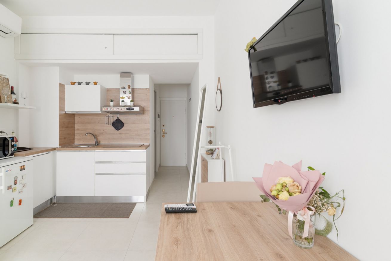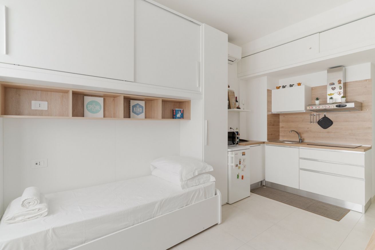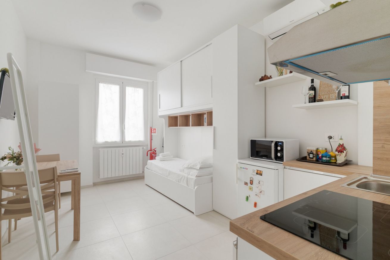 Accogliente e luminoso monolocale di 21 mq, perfetto per 2 persone, al 6° piano di uno stabile dotato di ascensore, ma con gradini per accedere.