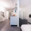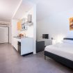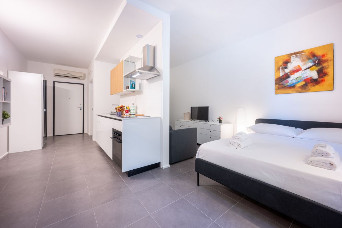 The apartment consists of a living room with kitchenette, a sleeping area, and a bathroom.