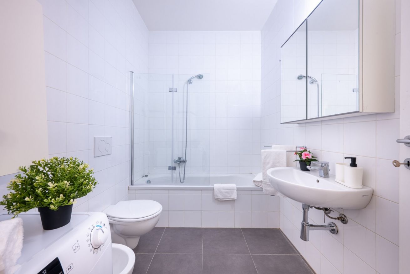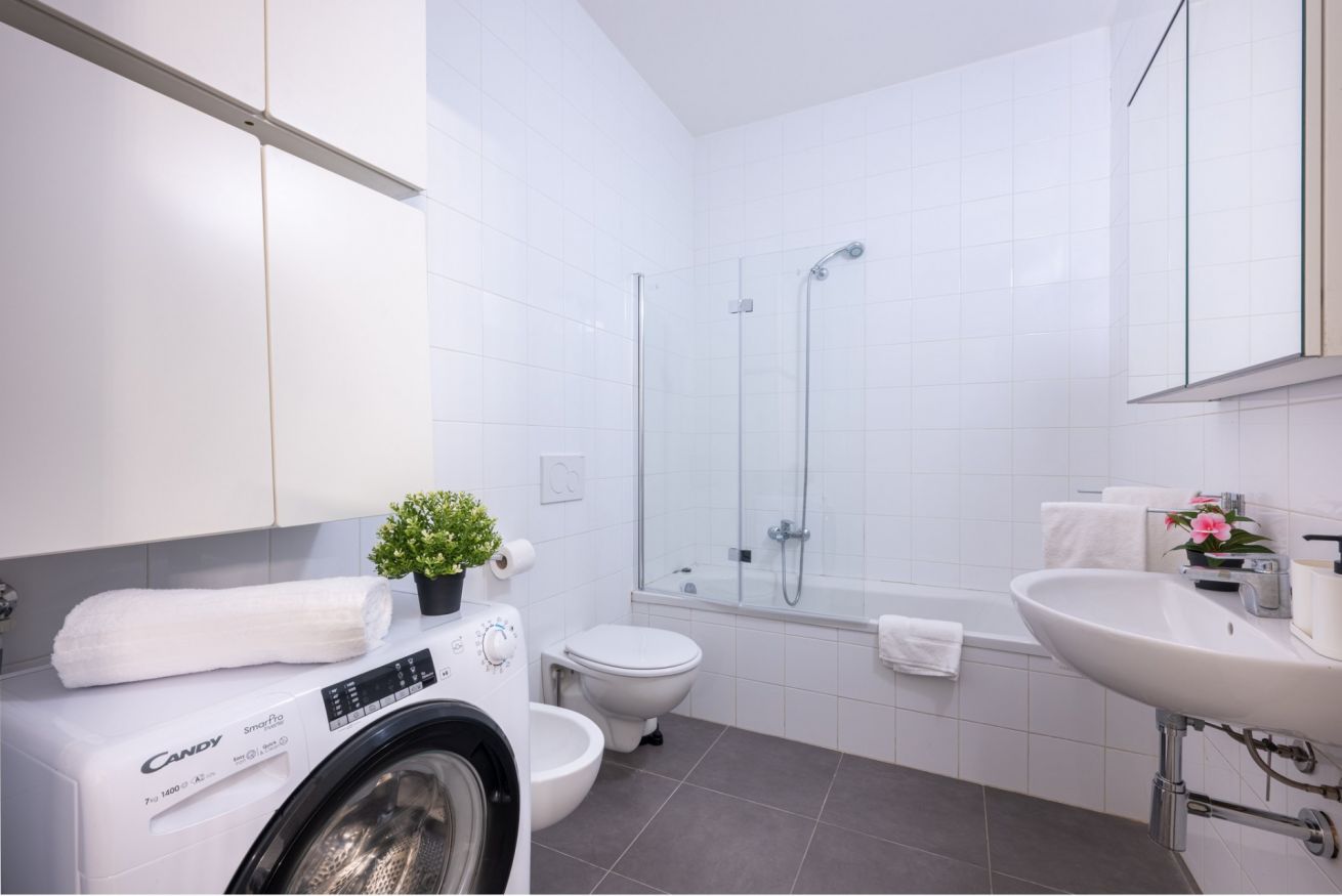 - BATHROOM with a bathtub with shower, sink, bidet, toilet, and washing machine.