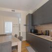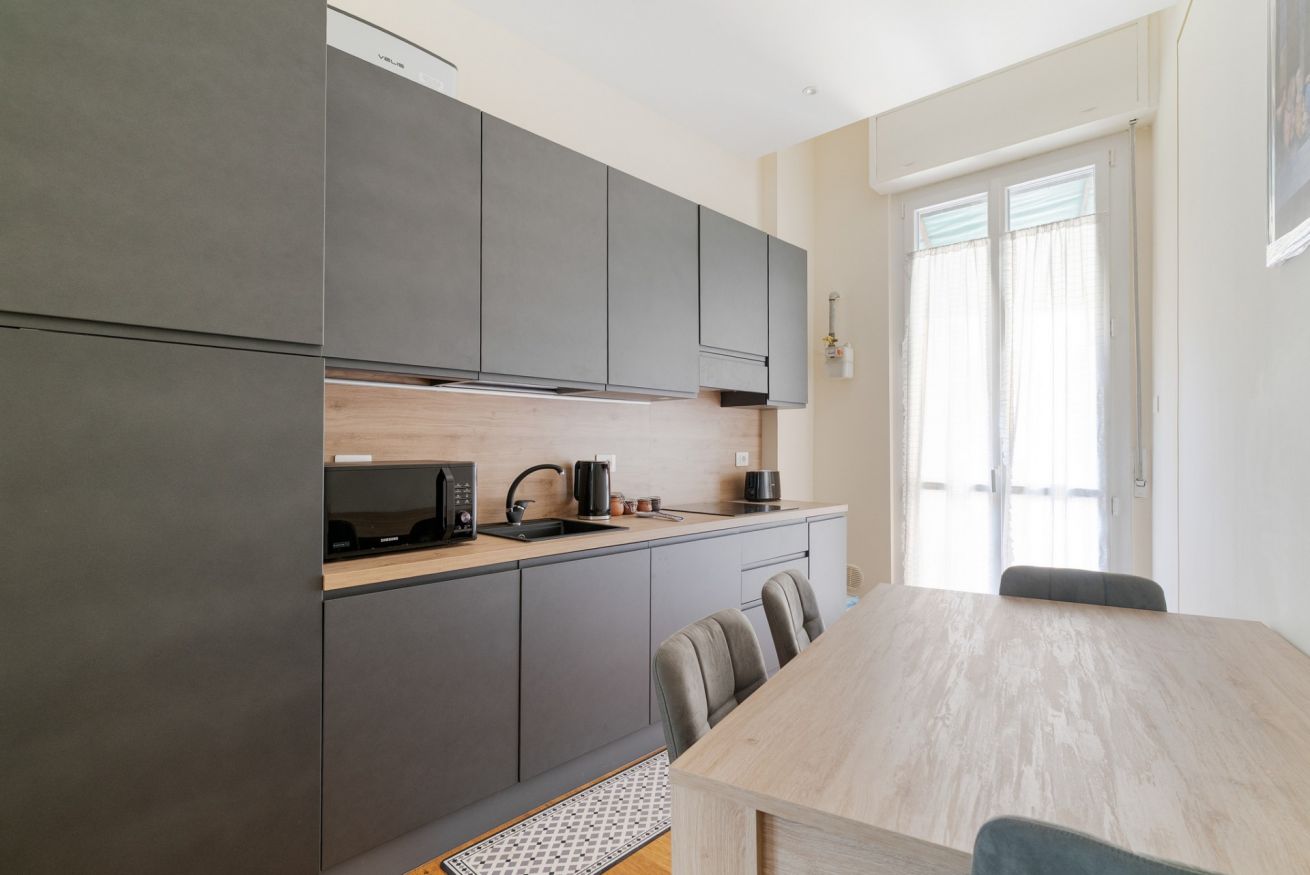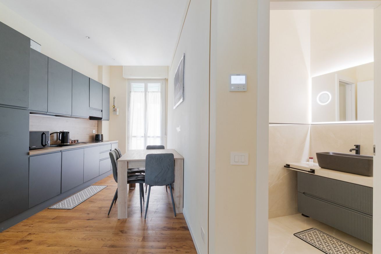 - CUCINA con piano cottura ad induzione, tavolo con sedie da pranzo, forno, forno a microonde, frigorifero, freezer, lavastoviglie, bollitore, macchina del caffè, calici da vino, utensili da cucina e accesso al balcone;