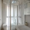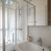 - BATHROOM with slightly raised shower stall, sink, bidet, toilet;