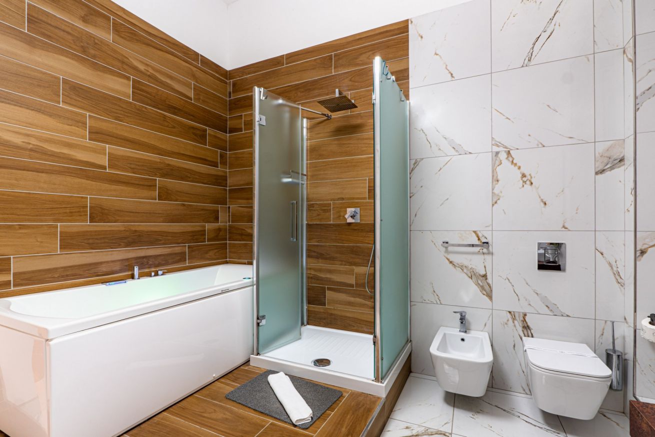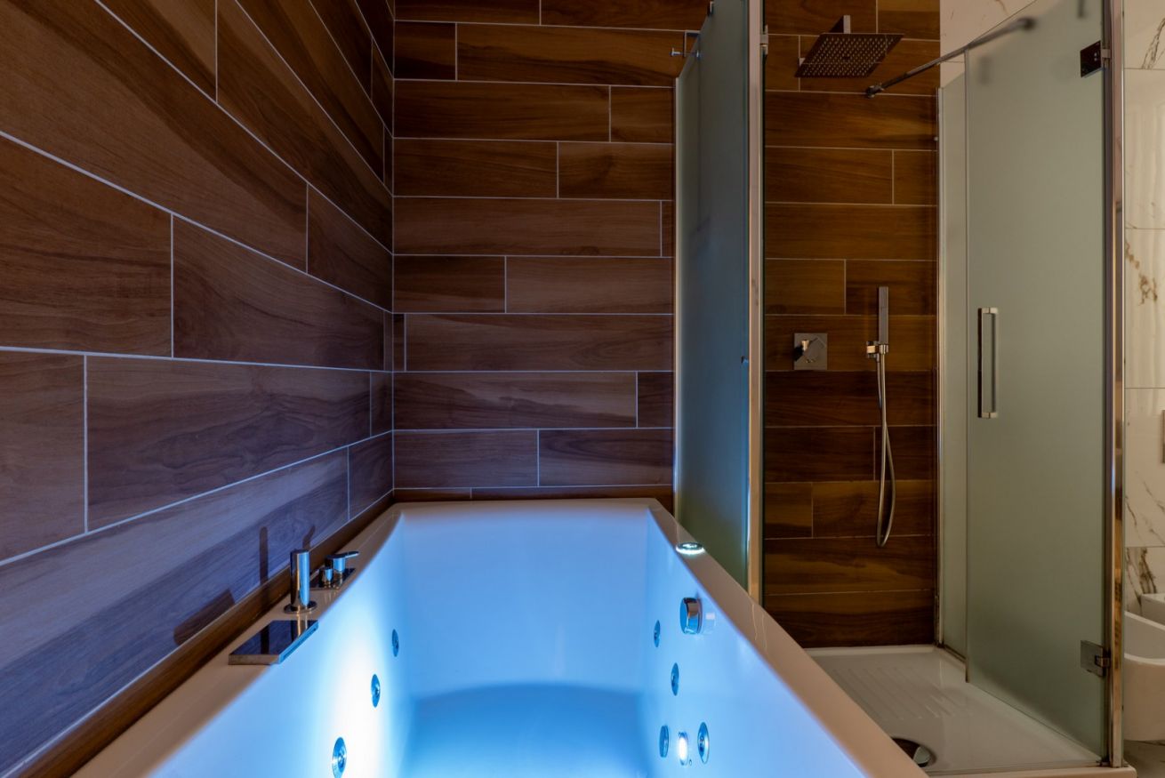 - BATHROOM with whirlpool tub, raised shower stall, sink, bidet, and toilet.