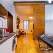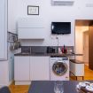 - LIVING ROOM with KITCHENETTE (induction stovetop, refrigerator, freezer, capsule coffee machine, kettle, microwave, and various kitchen utensils), dining table, flat-screen TV, sofa bed, and access to the balcony;