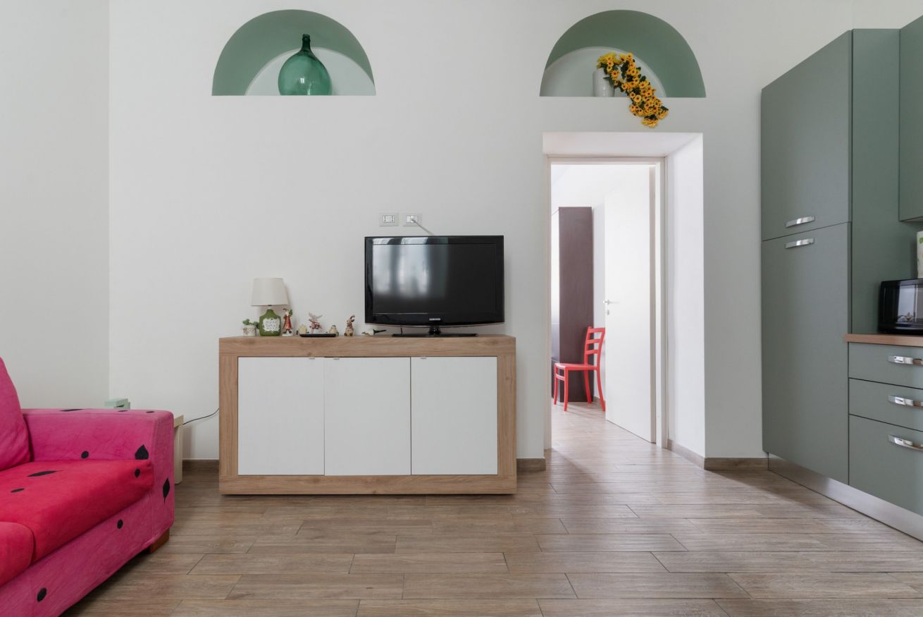 - LIVING ROOM with KITCHENETTE (gas stovetop, refrigerator, freezer, oven, microwave, kettle, moka pot, wine glasses, and various kitchen utensils), dining table, double sofa bed, and flat-screen TV;