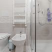 - BATHROOM with raised shower stall, sink, bidet, and toilet.