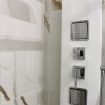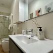 - BATHROOM with raised shower stall, sink, bidet, and toilet.