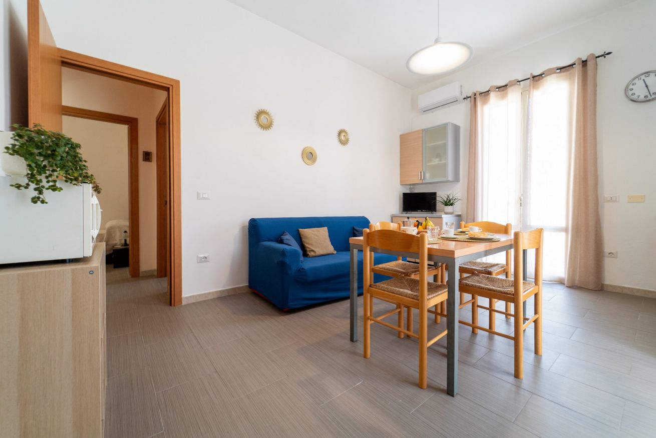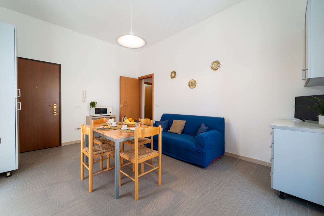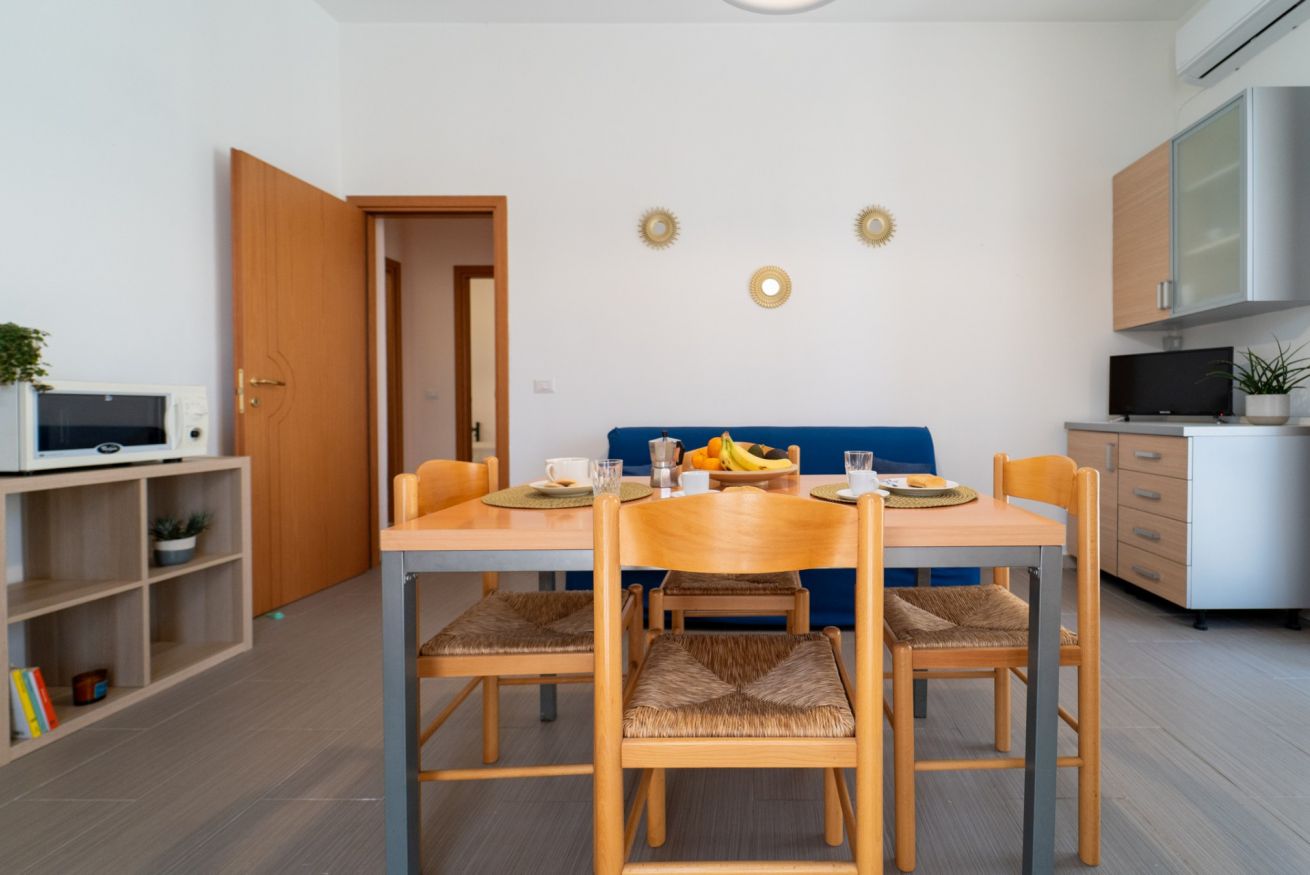 - SOGGIORNO con ANGOLO COTTURA (piano cottura a gas con 4 fuochi, frigorifero con freezer, moka, forno, forno a microonde, vari utensili da cucina e calici da vino), tavolo da pranzo, TV a schermo piatto e divano;