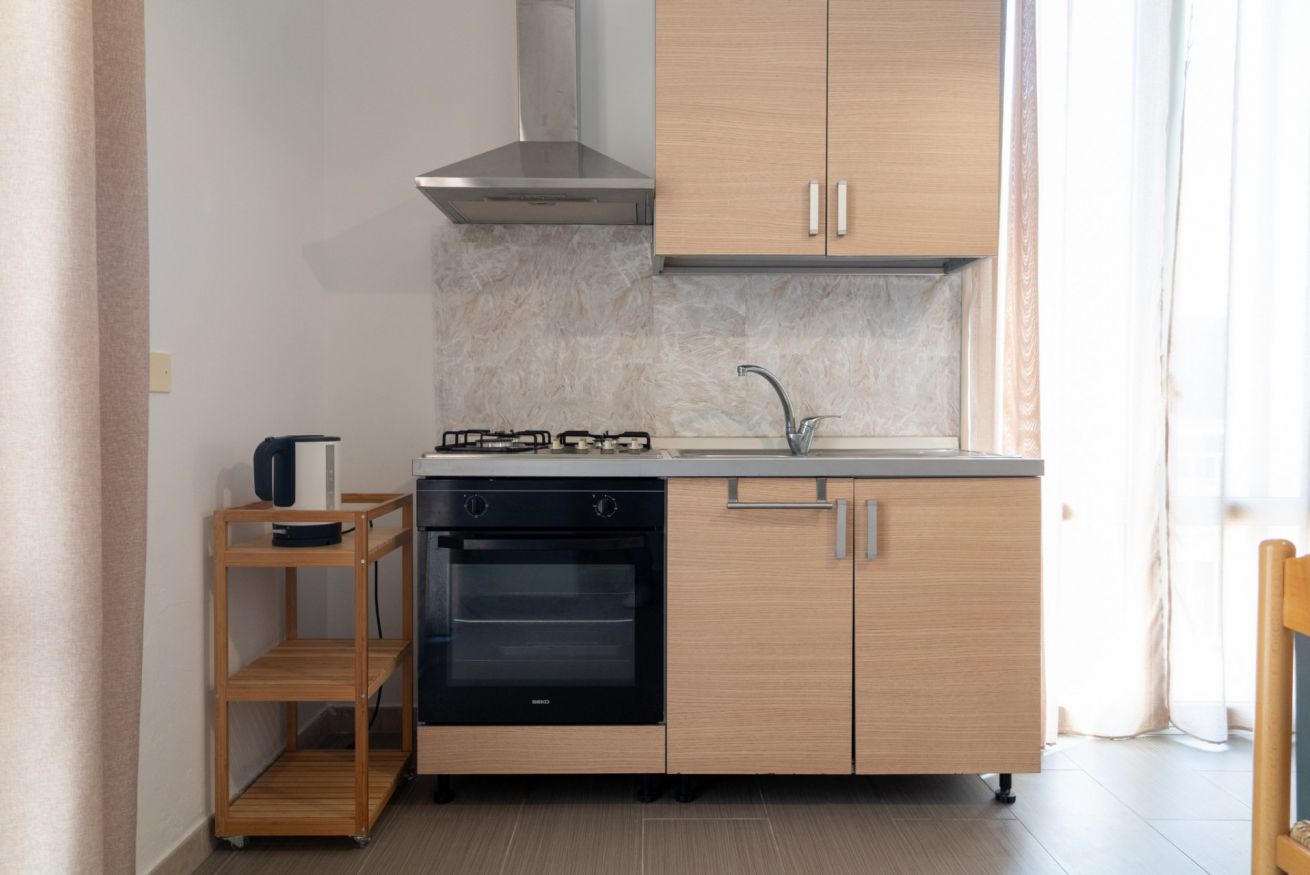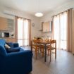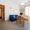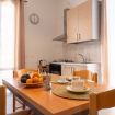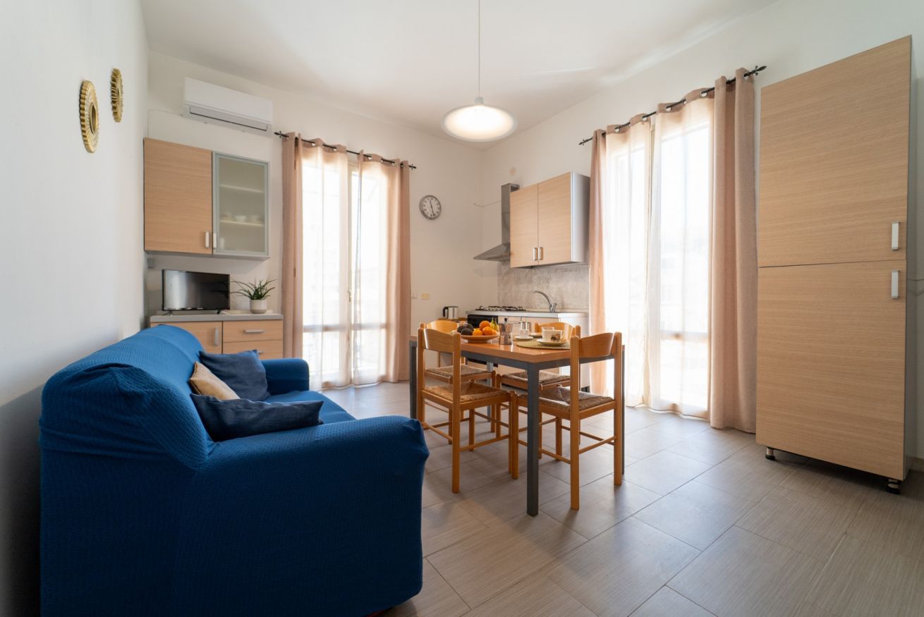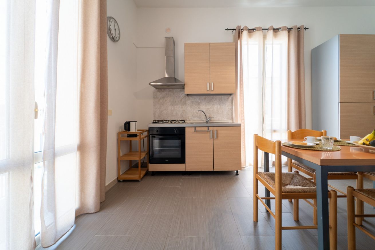 - SOGGIORNO con ANGOLO COTTURA (piano cottura a gas con 4 fuochi, frigorifero con freezer, moka, forno, forno a microonde, vari utensili da cucina e calici da vino), tavolo da pranzo, TV a schermo piatto e divano;