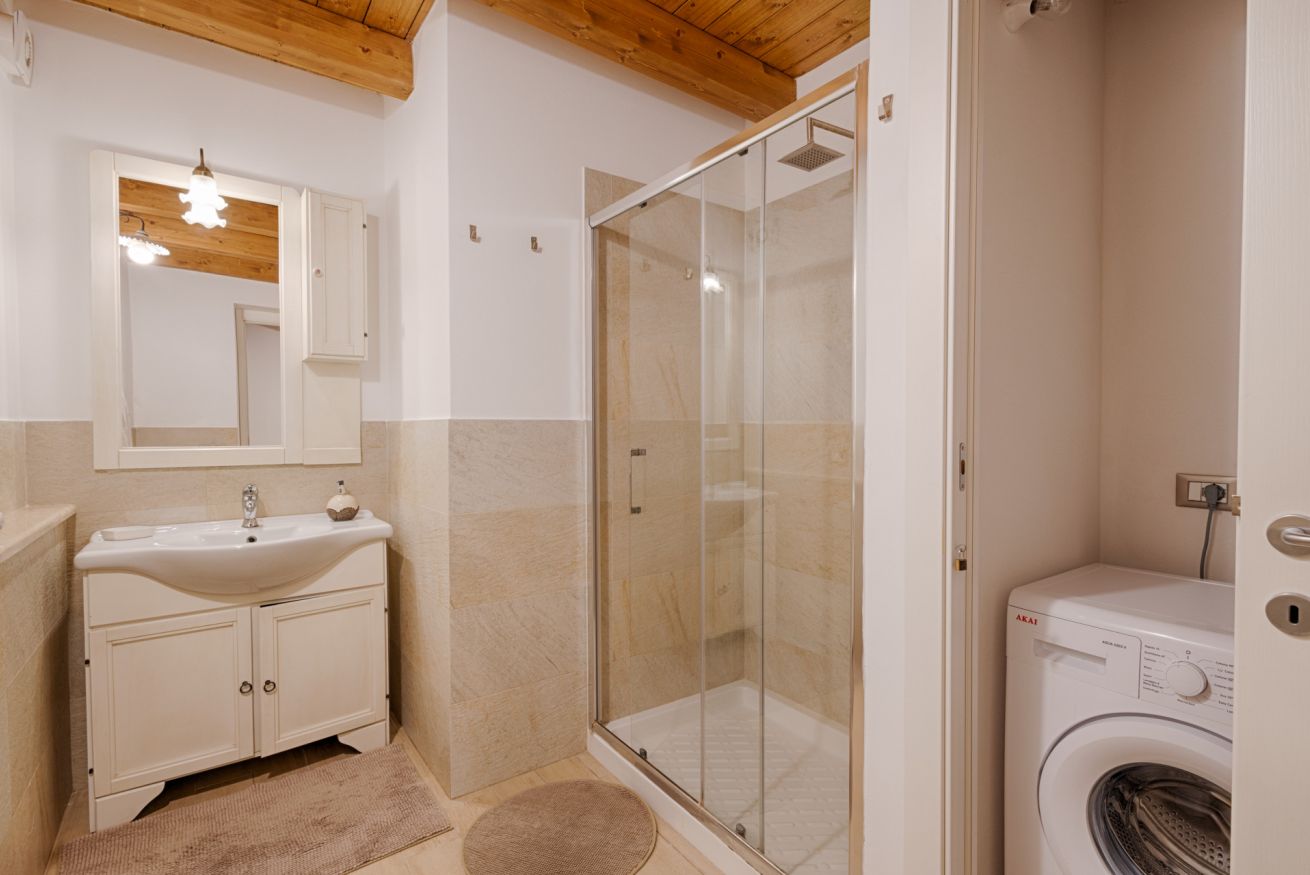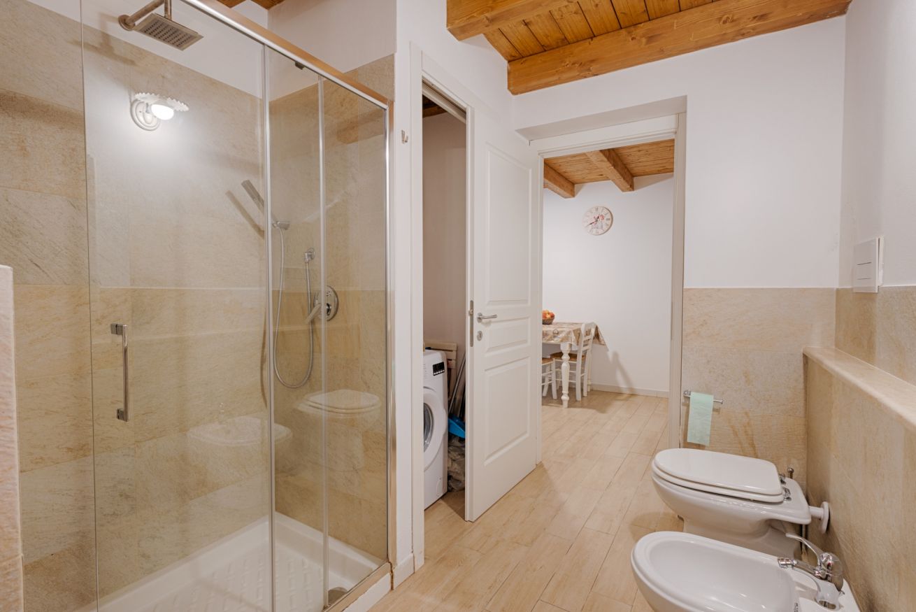 - BATHROOM with shower, washing machine, sink, bidet and toilet.