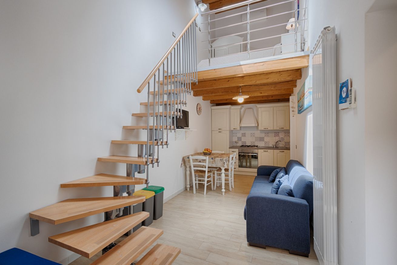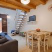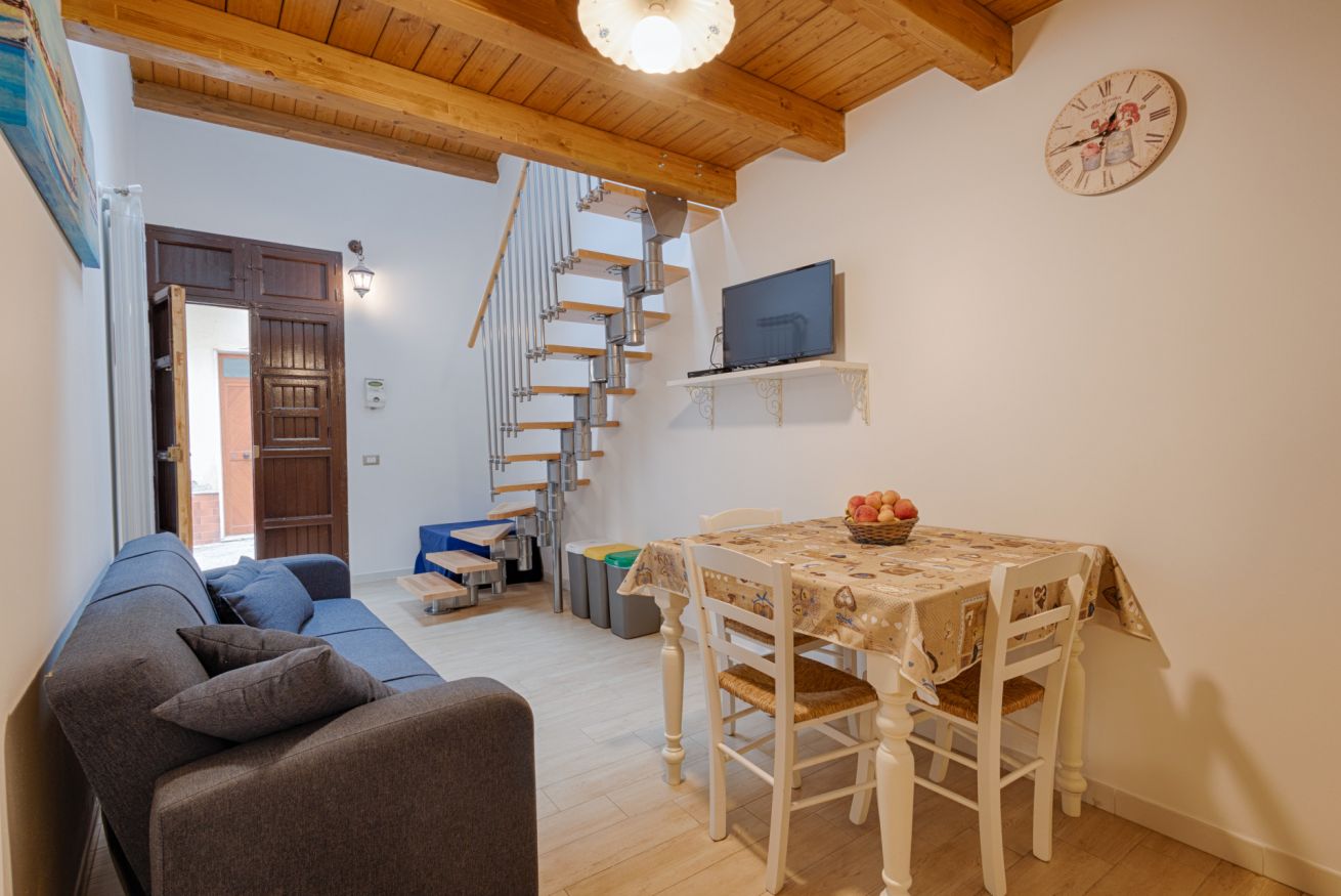 - LIVING AREA with KITCHENETTE (with gas hob, fridge, moka coffee maker, oven, kitchen utensils and wine glasses), single sofa bed, TV and dining table;