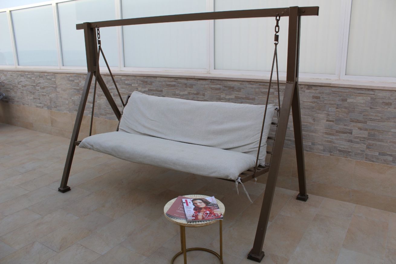 - TERRAZZO con lavabo, due sedie a sdraio, dondolo, tavolo da pranzo con 4 sedie e tavolino rotondo con due sedie.