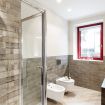 Bathroom. Shower box, toilet, bidet and hairdryer.
