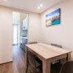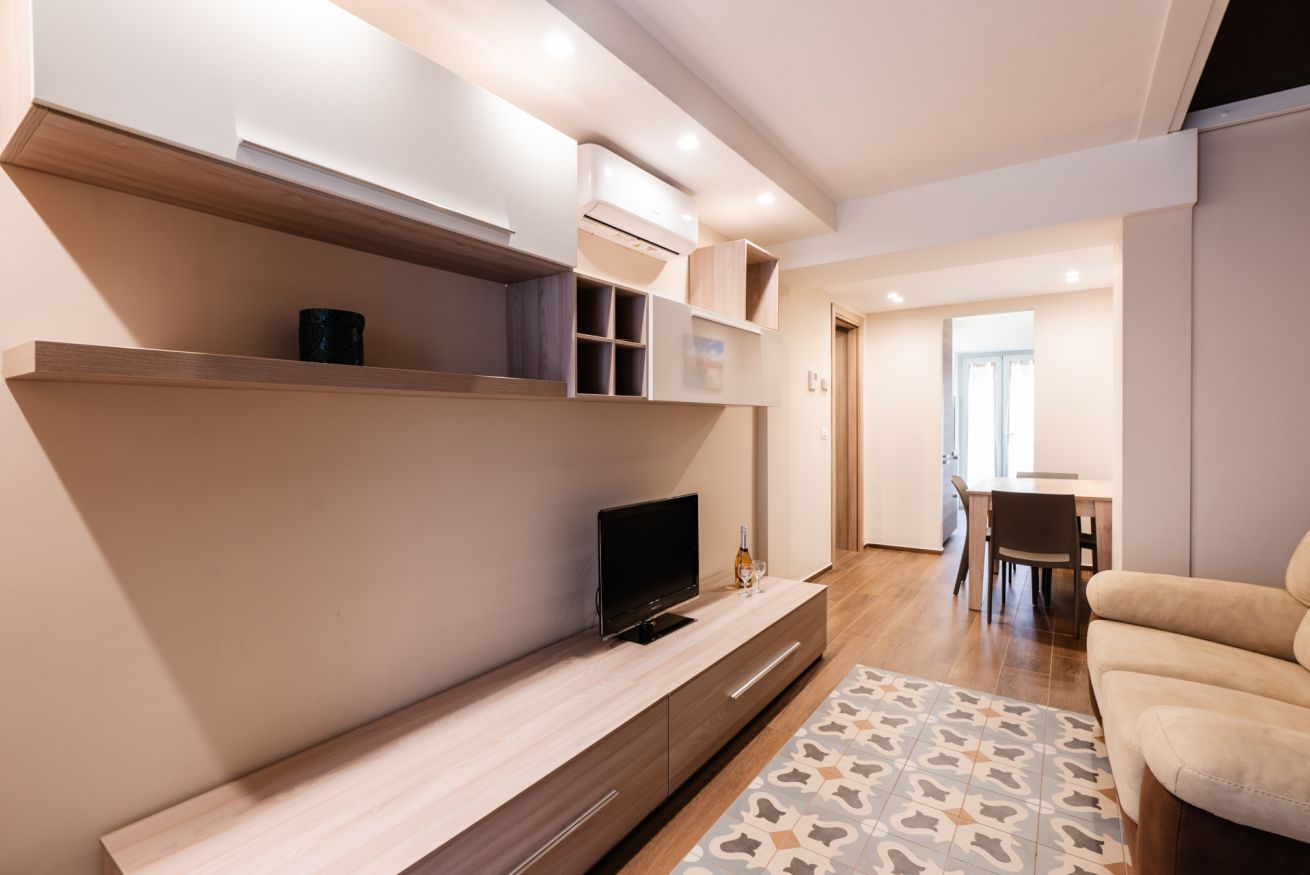 - LIVING ROOM with sofa, TV, dining table, and split A/C;