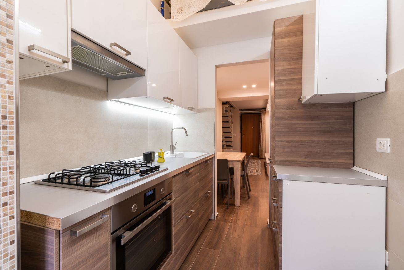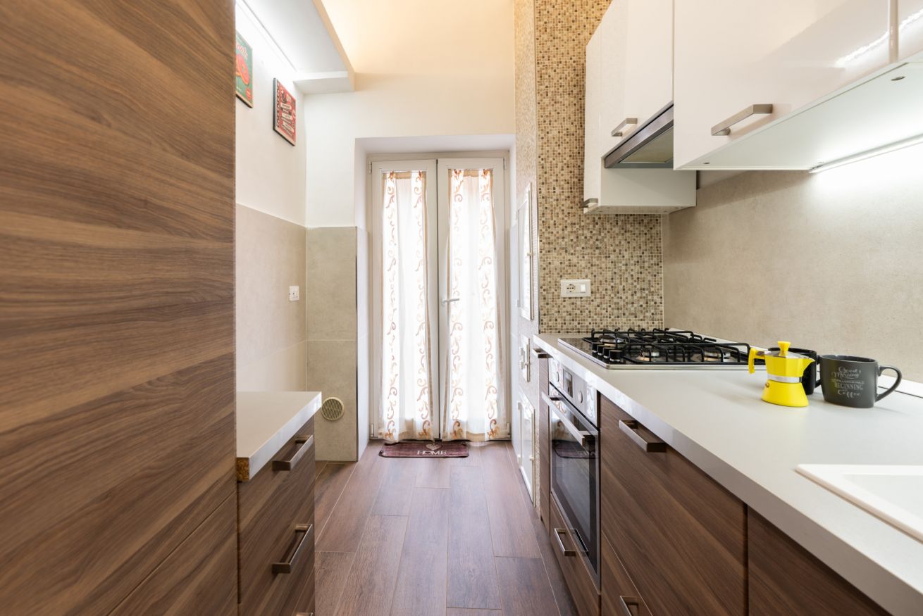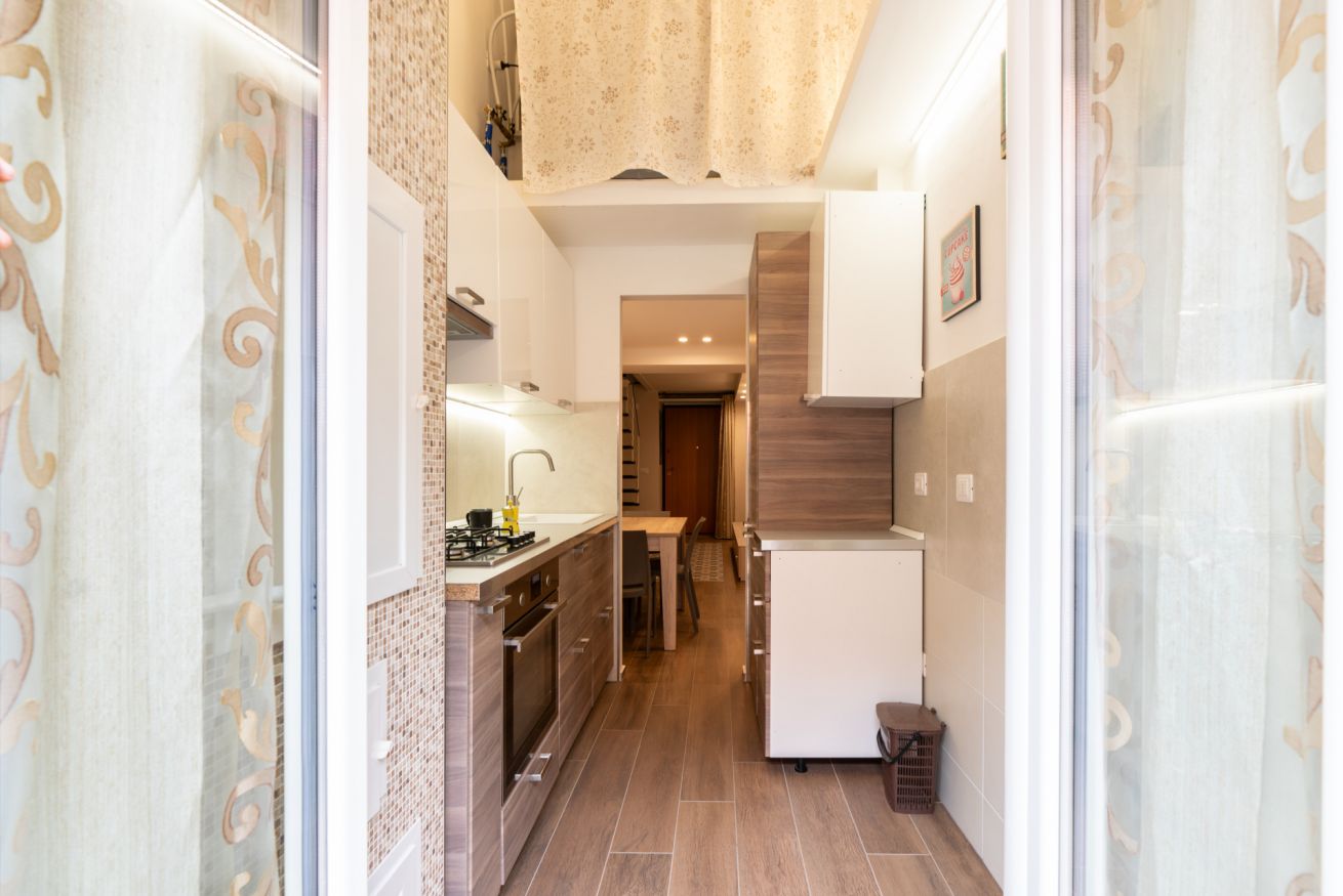 - KITCHEN with gas stove, refrigerator with freezer, Moka pot, dishwasher, oven, kitchen utensils, and access to balcony I;