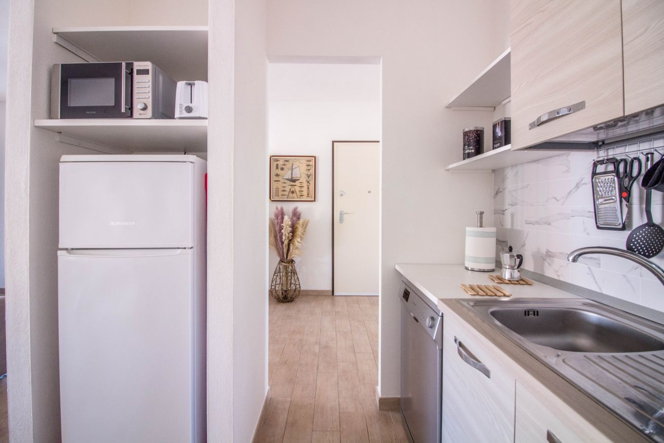 - KITCHENETTE with gas hob, refrigerator with freezer, coffee maker, dishwasher, kettle, oven and microwave, toaster, various kitchen utensils, wine glasses, access to the balcony;