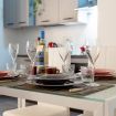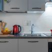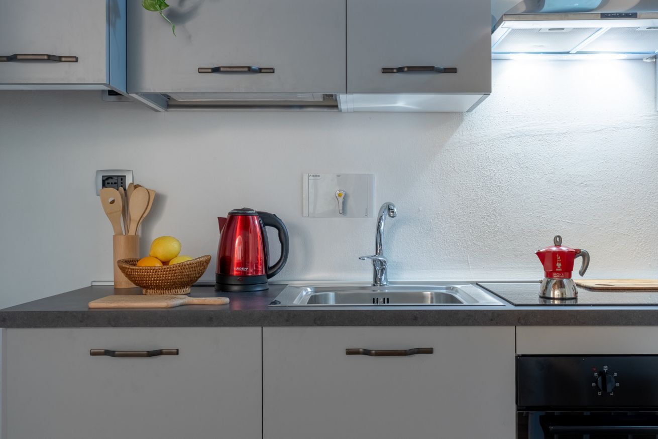 - ZONA LIVING con ANGOLO COTTURA (con piano cottura a induzione, frigorifero, moka, bollitore, forno, calici da vino e vari utensili da cucina), tavolo da pranzo, TV e divano letto matrimoniale;