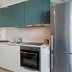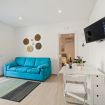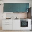 LIVING AREA. Kitchenette complete with mocha, traditional oven, various utensils and sofa bed.