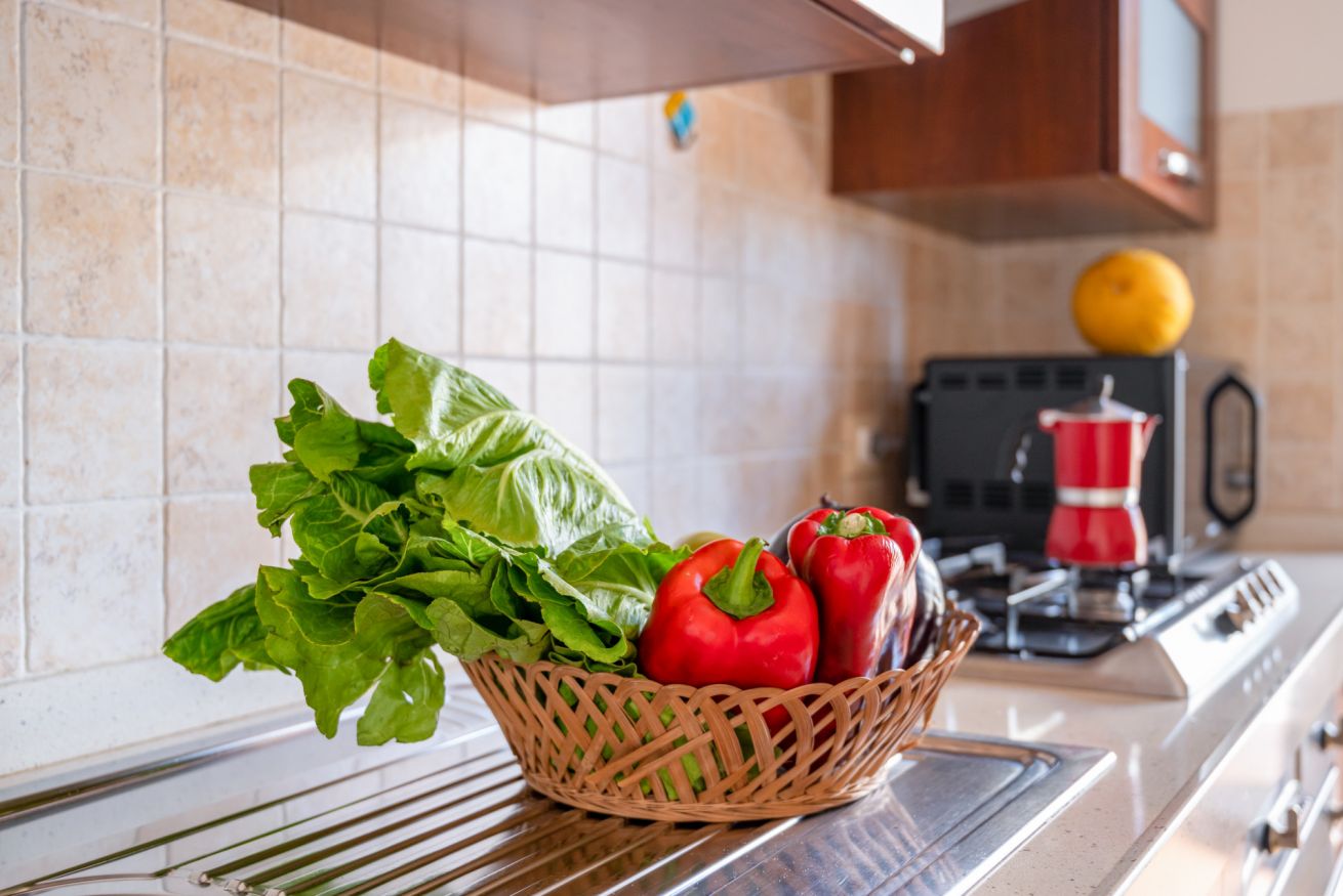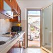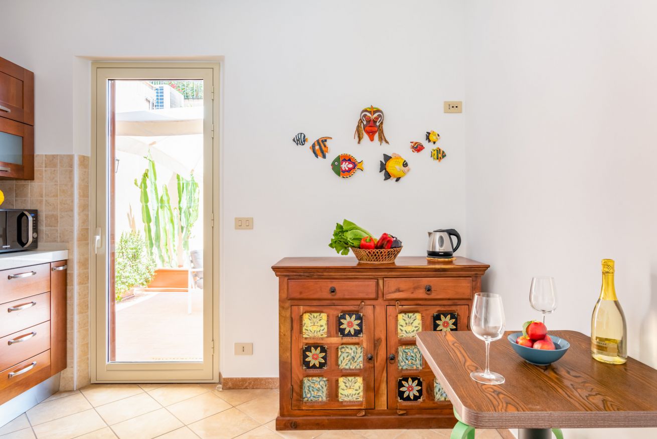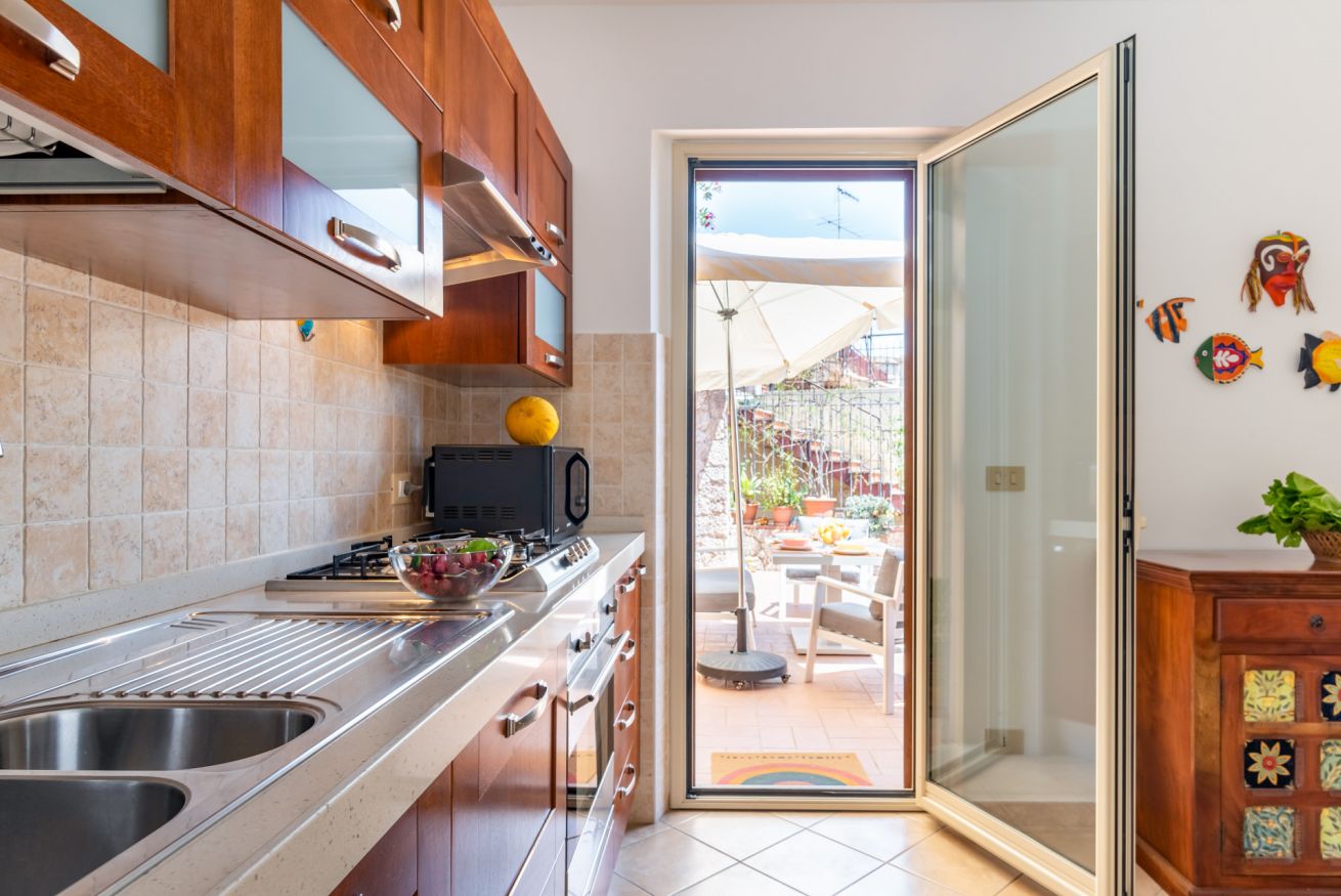 -CUCINA con piano cottura 4 fuochi a gas, frigorifero, freezer, lavastoviglie, forno, microonde, bollitore, moka, piccolo tavolo e accesso al terrazzo.