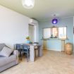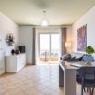 -SOGGIORNO con divano, tavolo, tv e accesso al balcone.