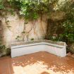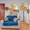 The accommodation consists of two bedrooms, a living area with a kitchenette, a bathroom and a large courtyard with outdoor furniture.